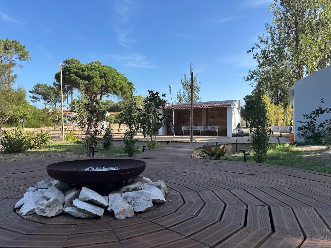The venue has a spacious outdoor area where, if the weather allows, you’ll experience one of the practices. There is a cosy fire pit area as well as shade. Lunch can be enjoyed either outdoors or indoors and you’re free to explore the gardens during the breaks.